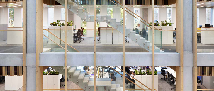High levels of GGBS and a lean ribbed-slab structure have helped to reduced embodied carbon by 30% at Tatehindle’s admirably restrained HQ for the Salvation Army. Image: Jack Hobhouse.