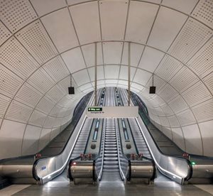 The station has two entrances, some 400m apart, and as you enter the westernmost of these, at Cowcross Street, the first of the spectacular ceilings is soon visible. Known as the upper apse, it comprises a lattice of concrete beams arranged in a diamond pattern. These support the sloping concrete panel soffit of a wide stairway with escalators leading down to the station’s intermediate level. The beams are massive – up to 12m long. Yet they are also smooth and elegant.