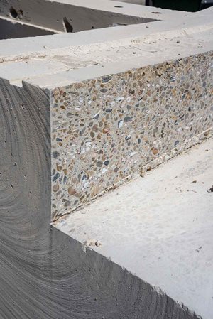 Various cement colours and aggregate sizes were trialled before a pale mix with 10mm aggregate was chosen. The surface of the units was also grit-blasted to match the existing texture.