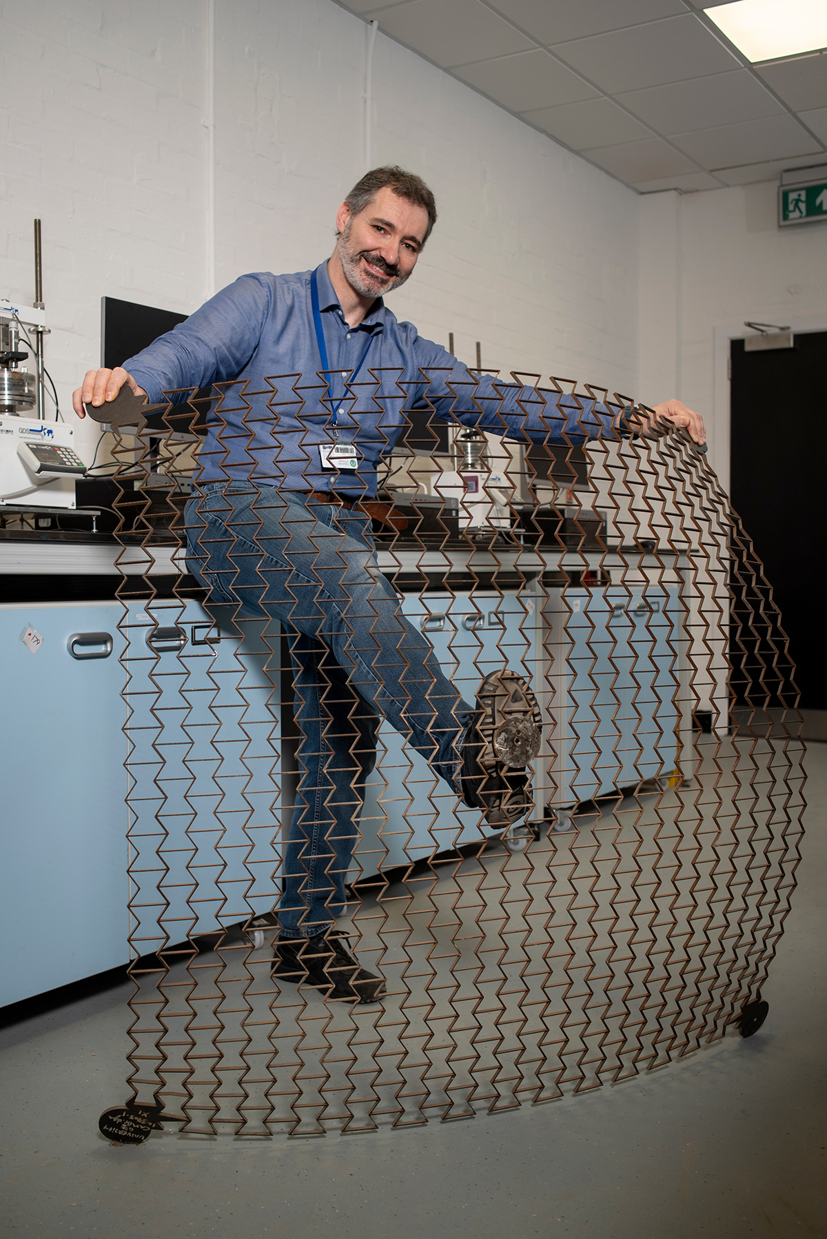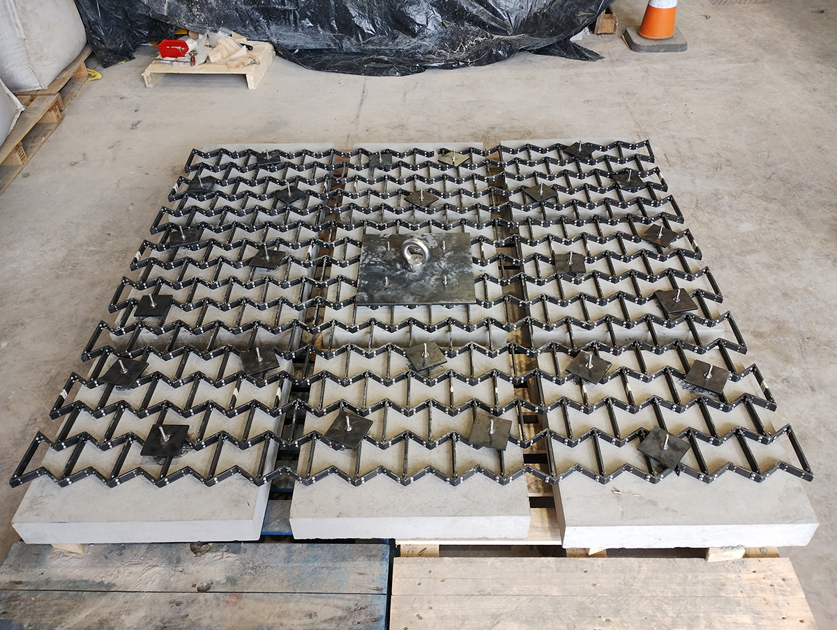 Vinai’s team have already proved it can be done using an auxetic steel grid that had been water-cut from a solid steel sheet. But this is inefficient in terms of wasted steel. So their first full-scale steel grid is made with thousands of individual components that can be assembled like Meccano, resulting in cells about 150mm long. “At 25mm thick, and 2m square, we think it might be the world’s largest-ever auxetic grid.”