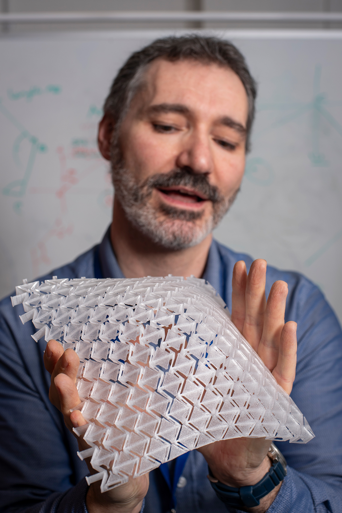 Domes are structurally very efficient, but are seldom constructed because they are very labour-intensive. Making formwork for concrete domes is challenging, but because auxetic grids bend synclastically – identically in all directions at once – they can form them easily. Our goal now is to use auxetics to develop deployable supporting structures for domes.”
