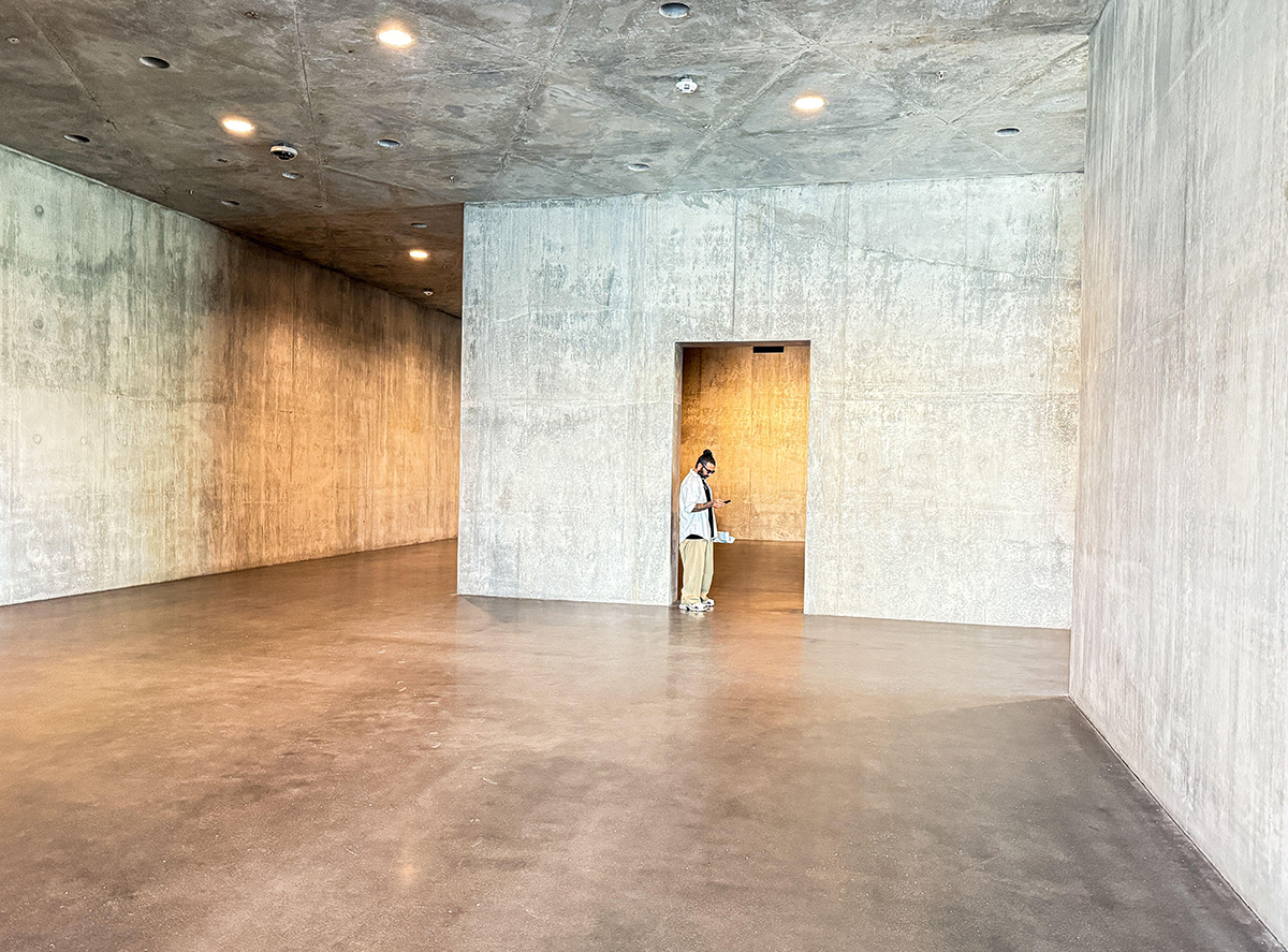 Clark and Zumthor worked through more than 100 samples and two full-scale mock-ups to define the precise specification of the concrete. Different formwork finishes, including MDO and HDO plywood, phenolic plywood, high-density polyethylene (HDPE), and extruded plastic, were used to produce distinct surface characteristics. The board layouts follow a precise pattern throughout – notably, the soffit has an equilateral triangular joint pattern that fits together perfectly from the north to the south tip of the building, coordinating with all of the lighting, sprinklers and air ducts.