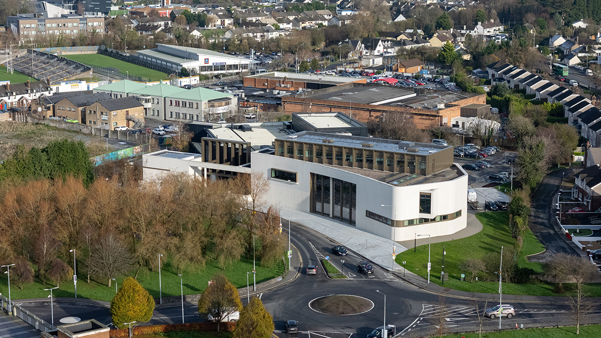 “The main entrance was curiously sited, facing away from the park and historic town centre,” says Keith Williams, founder and director of London-based Keith Williams Architects. When the practice won a 2015 competition to design a library and municipal art gallery next to Glór, it was an opportunity not just to establish a new cultural nexus, but also to reorientate it towards the town. “It was about improving visibility and really redefining this edge of Ennis.”
