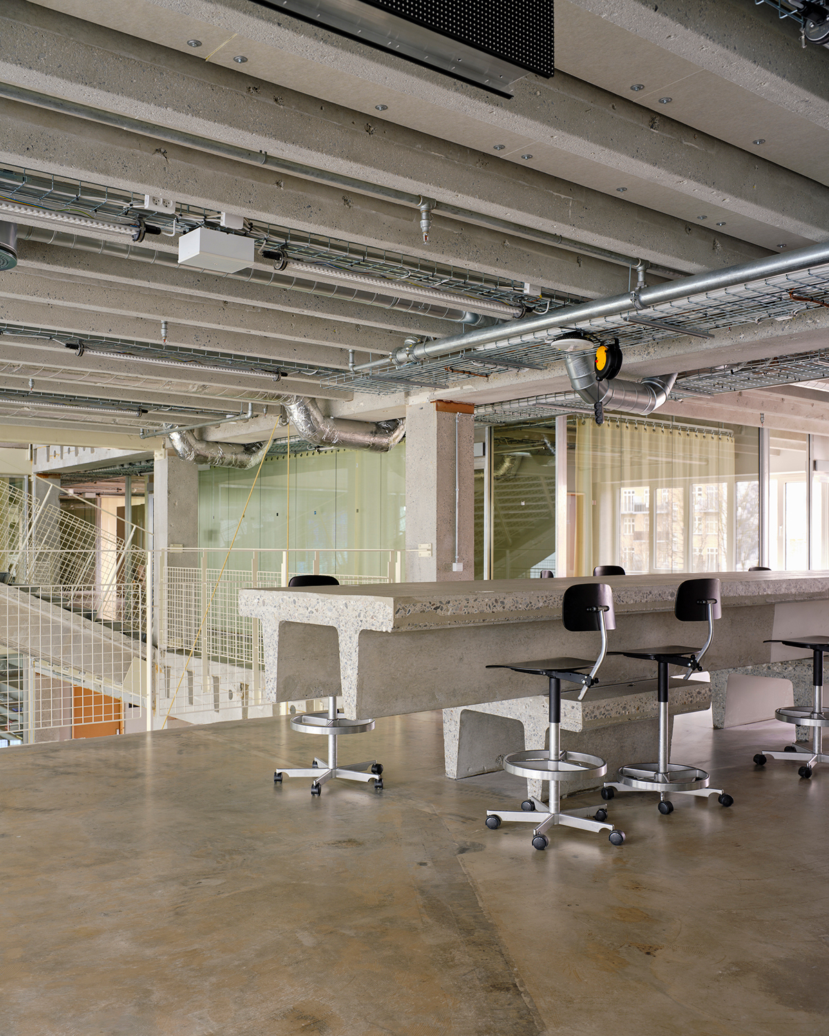 The aesthetic of inventive reuse and raw finishes continues throughout the building. The slab above the entrance has been cut out to create a double-height atrium, with the distinctive TT-profiled concrete repurposed as furniture, including a bar counter in the ground-level café. As you move up the building, smaller spaces such as studios and workshops are introduced, divided by untreated plasterboard and exposed door frames.