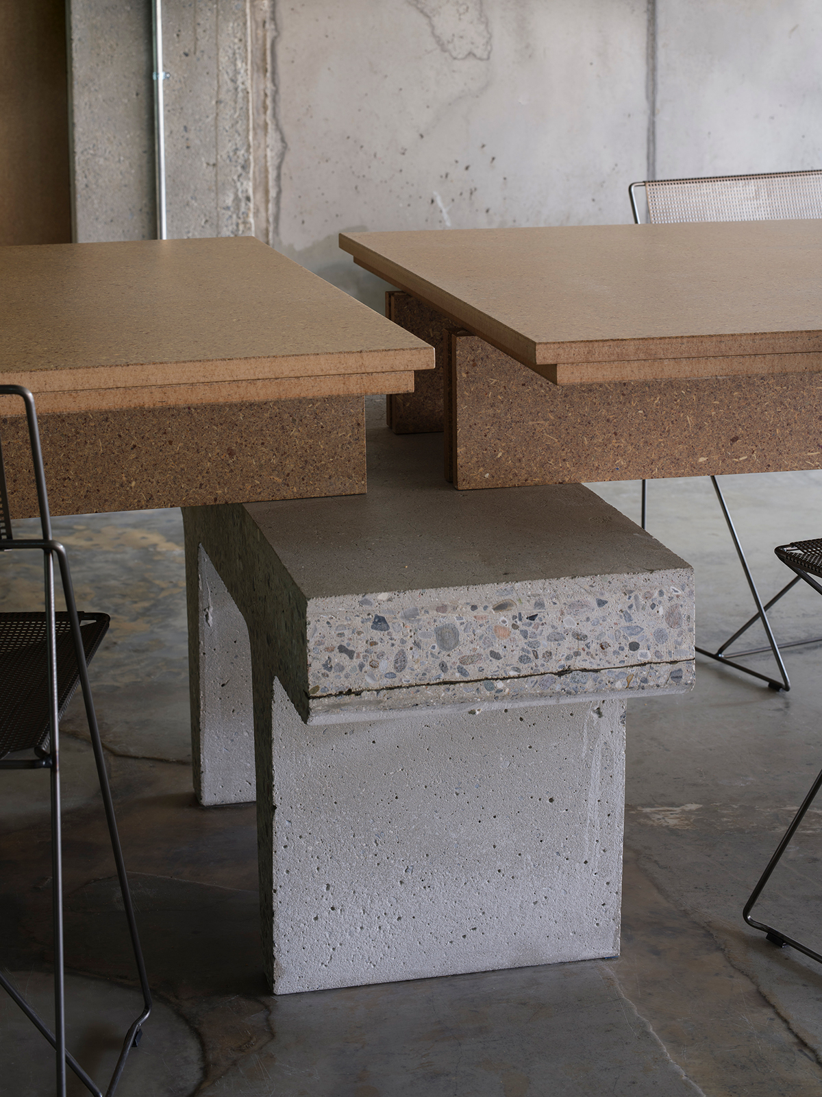 Plain mineral‑wool board fills the gaps in the TT decks for acoustics. Waste wood from the original building has been shredded and re-formed as MDF-type panels. Metal has been compressed into blocks, used as table legs, magazine holders and other furniture.