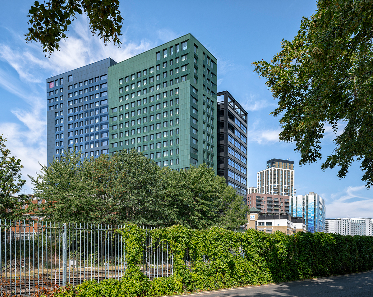 All four towers were designed by Allford Hall Monaghan Morris, and step from 11 to 19 storeys in a slightly askew arrangement. The three student towers, which contain 852 bedrooms, are clad in glazed terracotta, in shades of blue, green and purple. The fourth tower – dark grey with horizontal bands of glazing – is an office building. This is not part of the Passivhaus scheme, but it has achieved a BREEAM Outstanding rating, partly thanks to an innovative low-carbon precast concrete floor system.
