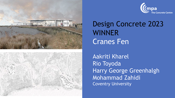 First Prize was awarded to Aakriti Kharel, Rio Toyoda, Harry George Greenhalgh and Mohammad Zahidi of Coventry University for their project 'Cranes Fen'. The judging panel agreed that the design demonstrated excellent sensitivity to the site context from concept to detailed design. Material was used efficiently and details were well developed. The submission also demonstrated an excellent understanding of locally available, low carbon cements and aggregates.