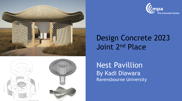 Joint Second Prize was awarded to Kadi Diawara, of Ravensbourne University for their project 'Nest Pavillion'. The judges were impressed with the exploration of light weight, curved sculptural forms possible using glass-reinforced concrete.