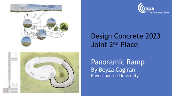 Joint Second Prize was awarded to Beyza Cagiran, of Ravensbourne University, for their project 'Panoramic Ramp'. The judges felt this design had a strong concept, informed by an exploration of different concrete construction techniques and opportunities for interesting surface textures as well as the use of locally available aggregate.