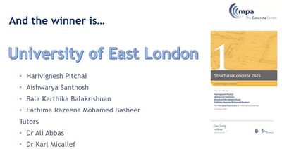 The Concrete Centre’s annual student Structural Concrete competition has been won by Harivignesh Pitchai, Aishwarya Santhosh, Bala Karthika Balakrishnan and Fathima Razeena Mohamed Basheer of University of East London.