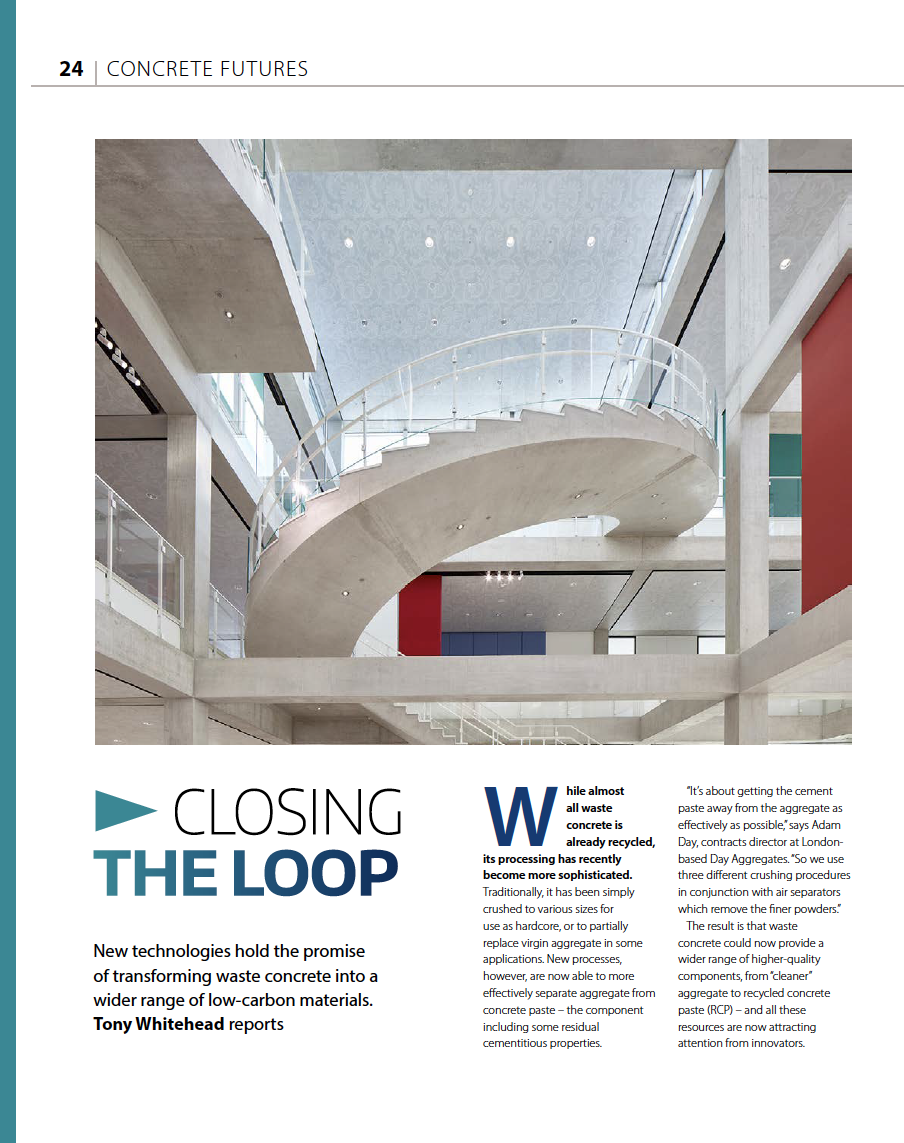 The article ‘Closing the Loop’ in Concrete Futures Spring 2024 explores innovative technologies for processing concrete waste. This is based on the Making Better Use of Recycled Concrete Demolition Waste conference held by the University of Cambridge and The Concrete Centre in November 2023. A full written record of the proceedings can be downloaded here, which also contains links to the recordings of each session.