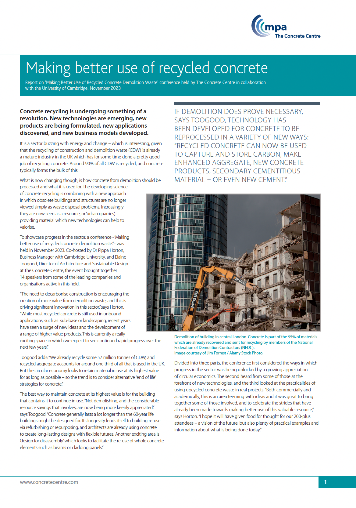 Report on ‘Making Better Use of Recycled Concrete Demolition Waste’ conference held by The Concrete Centre in collaboration with the University of Cambridge, November 2023.