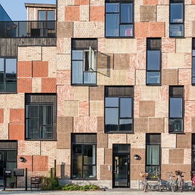 Image At Resources Row in Copenhagen, architect Lendager reused old bricks by angle-grinding entire sections of existing walls and embedding them into precastconcrete facade panels.