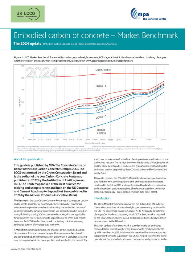 This guide presents the 2024 LCCG Market Benchmark, which is based on data from the MPA ready-mixed concrete produced in the UK in 2023 and supplemented by data from contractors and independent concrete suppliers. The data was based on a common carbon methodology - gross carbon emission data to EN 15804.