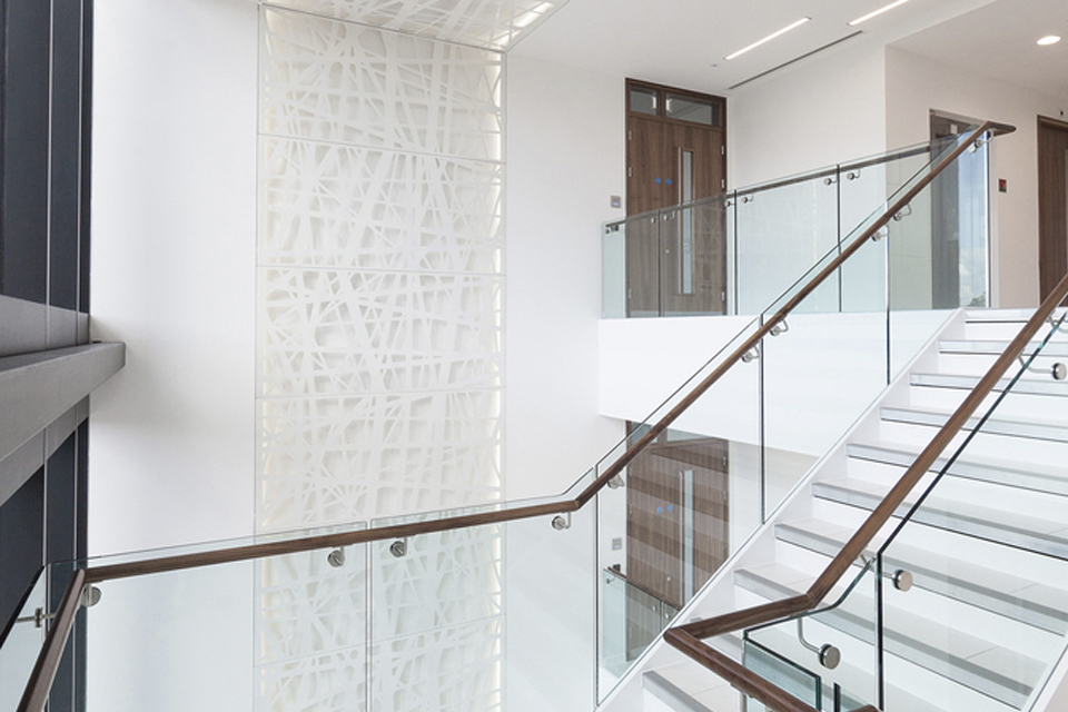 The thermal mass provided by the exposed concrete soffits works with an underfloor displacement ventilation system to provide low energy cooling. Other features which enhance the building’s environmental performance include solar hot water heating, solar control glazing, rainwater harvesting and a sustainable urban drainage paving solution. This helped achieve a BREEAM rating of "Very Good".