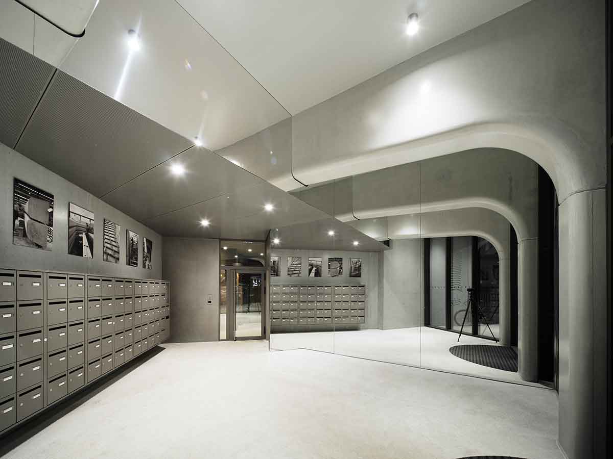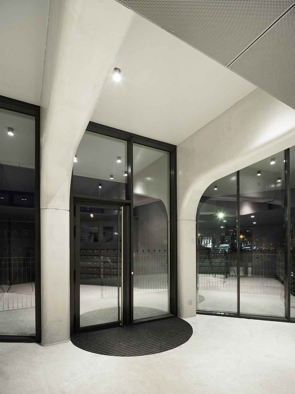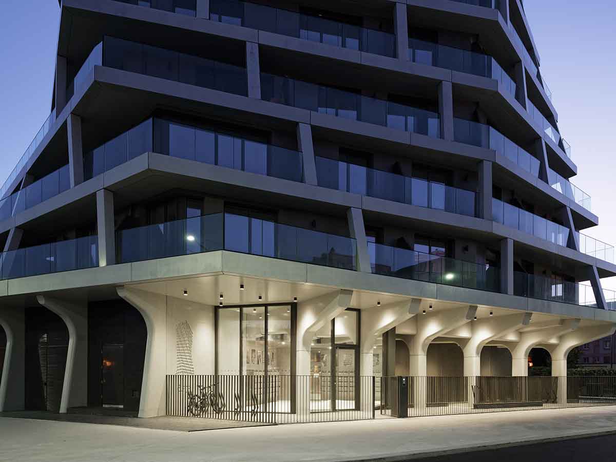 With its spiralling, asymmetrical form and gleaming balconies of glass and pale precast concrete, the residential tower neither fades into the background nor fits inconspicuously into its historically significant context.
