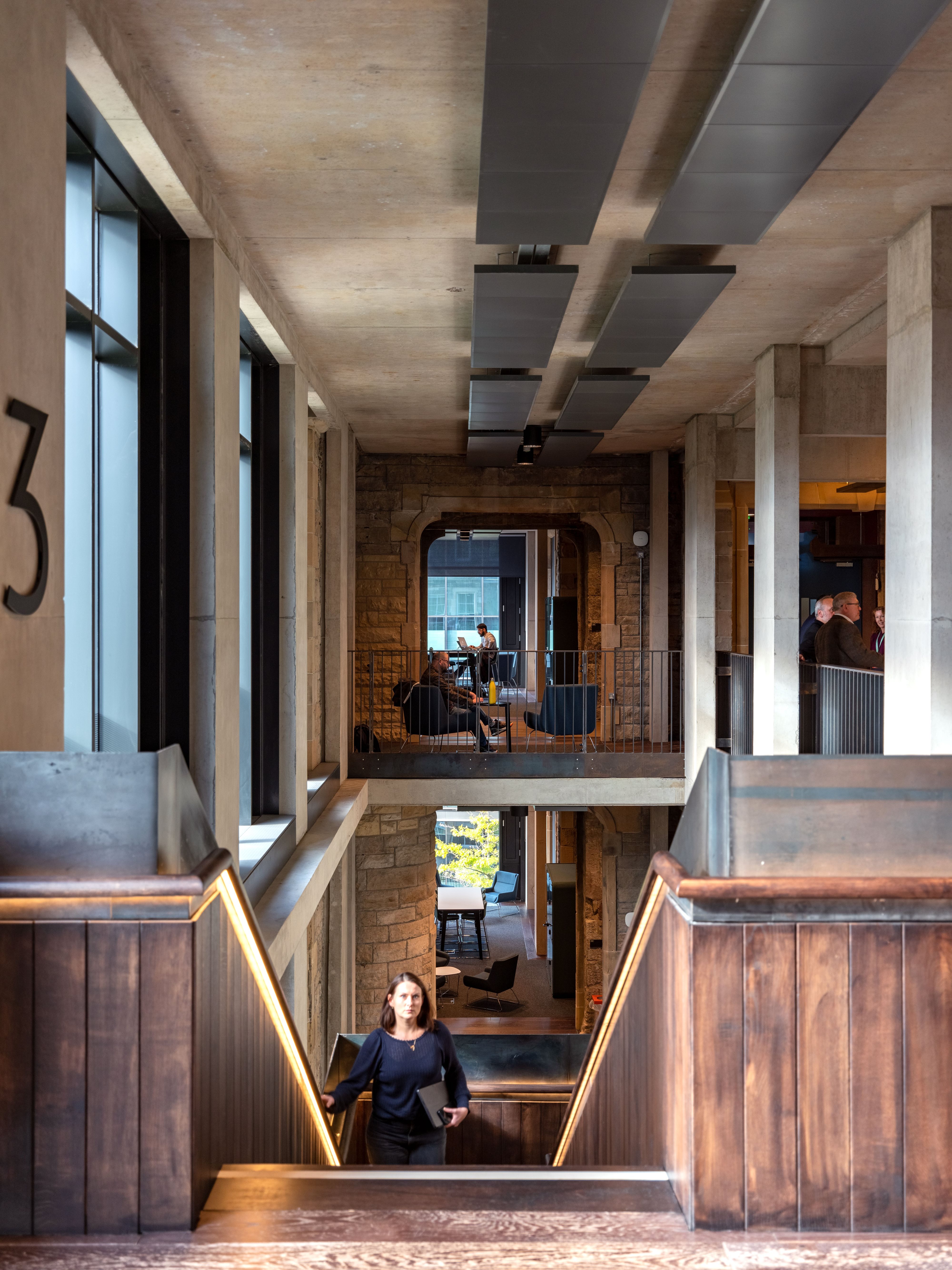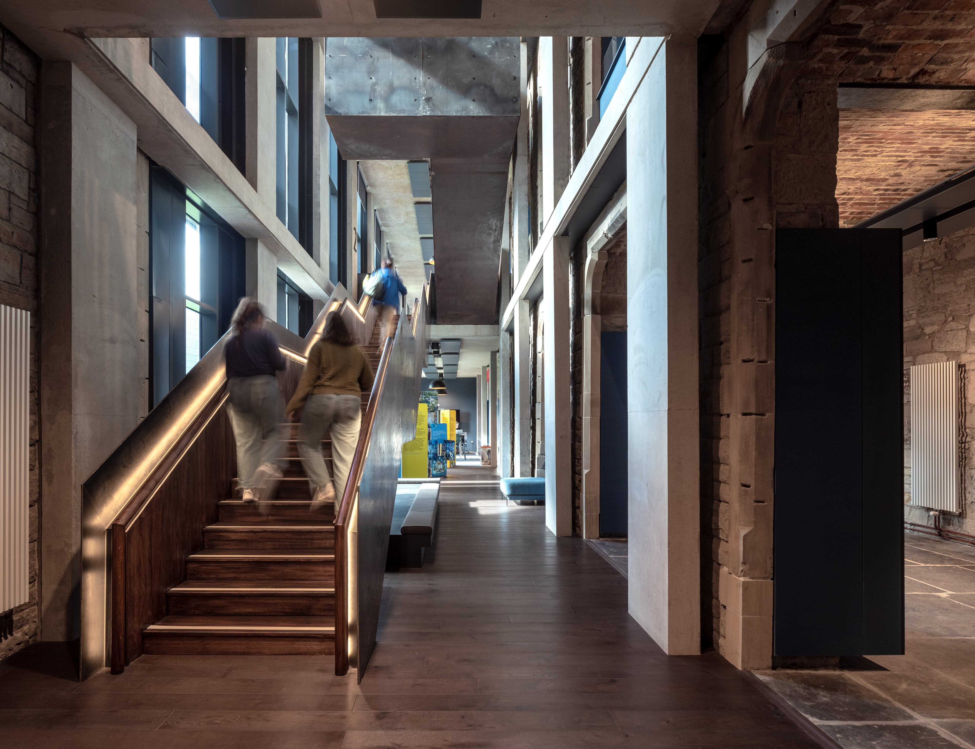 The structural concrete frames of the new extensions, located primarily between the north wings and along the south corridor are all exposed, and the clean lines of the visual concrete sit in contrast to the textured stone of the existing building.