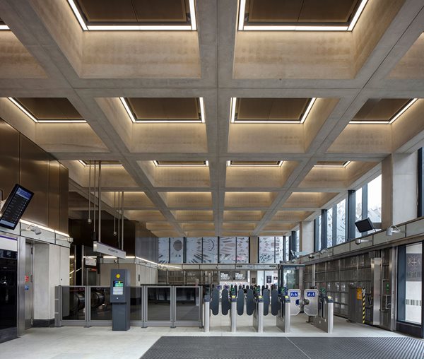Designers sometimes flaunt such “marks of making” for their own sake, but here the lines that grace the centres of the 600mm-wide concrete beams tell the story of the ceiling’s construction while simultaneously making it better-looking. The coffers are more than just structural and aesthetic features, however: they also house acoustic boards, and downlights that highlight the ceiling’s impressive concrete as well as illuminating the ticket hall. There will be plenty to admire, then, for the 82,000 passengers that are expected to use the station each day.