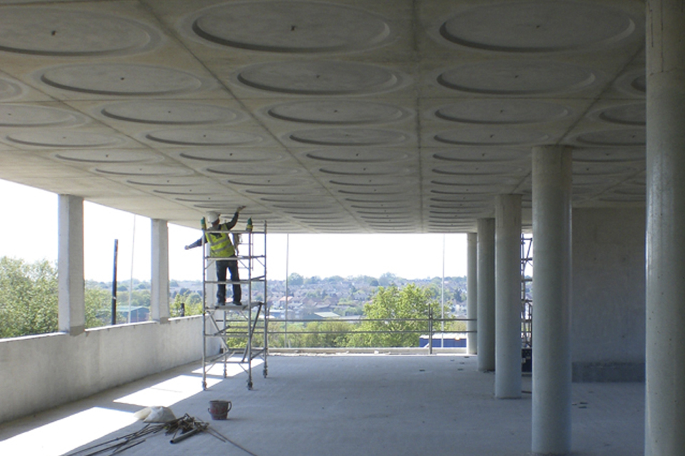 To reduce the embodied CO2 of the concrete a 50% ground granulated blast furnace slag (GGBS) concrete mix was used. Internal flexibility is helped by using a flat soffit within the 6m/7m x 6m structural grid. An interesting feature of the soffit is the regular array of a 25mm-deep, 1.2m-diameter circular recess which provides visual interest to the slab. The circular recesses were formed using plywood discs with chamfered edges fixed to the shuttering.