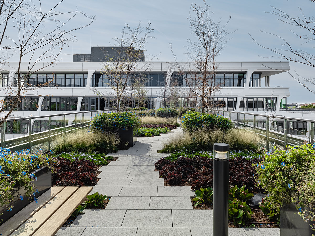 The building is powered by solar panels that cover approximately 1,000m2 of the roof, and heated and cooled by a ground-source heat pump sunk into the earth below. These and other measures, such as 28 electric car charging points, enabled it to achieve the DNGB Platinum standard – the German Sustainable Building Council’s highest rating. (It also won the innovative architecture category at the German Design Council’s 2022 Iconic Awards.)