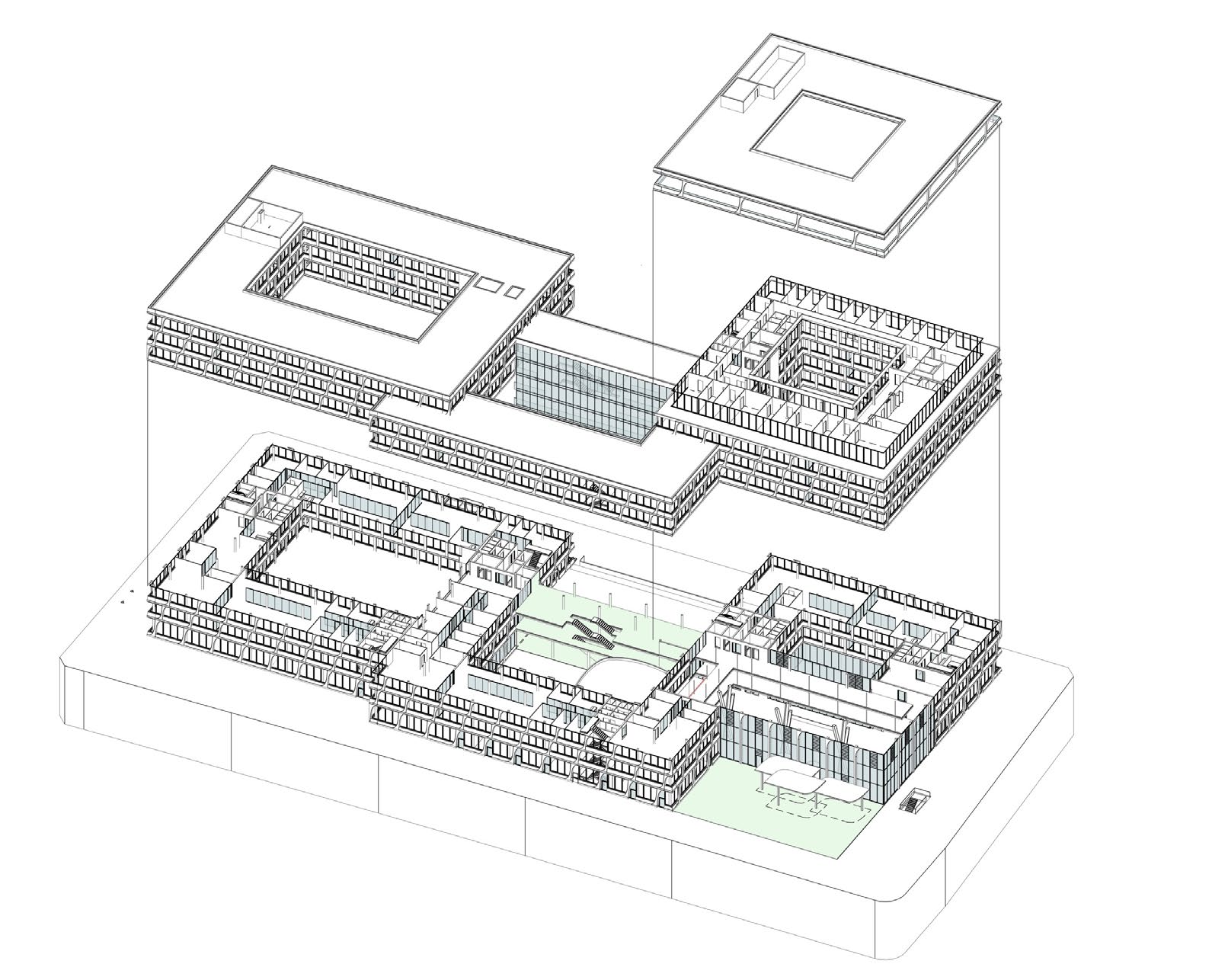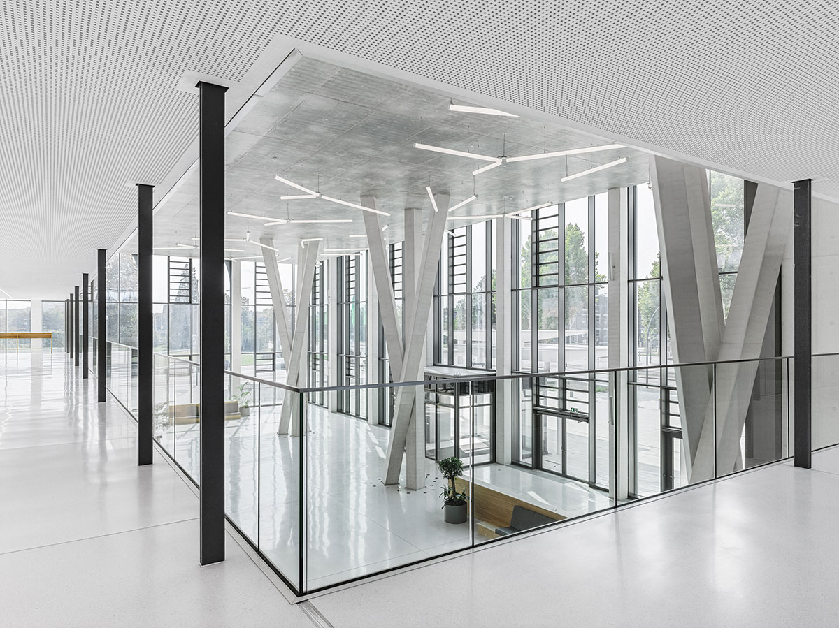 Comprising three connected blocks arranged around courtyards, the building’s in-situ concrete frame sits on a 0.8m-thick foundation slab, with 250mm-deep floor slabs. “Energy from the heat pump and the thermal mass effect of all the exposed concrete is a great combination,” says Gallus. “The concrete floors are actively heated and cooled by warm or cold water from the ground, run through pipes set in the slabs.” This works in conjunction with the passive effect of the exposed concrete soffits, which absorb excess heat in summer and store it in winter.