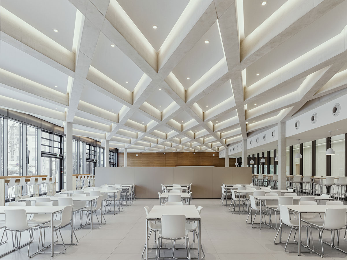 There is more to admire elsewhere in the building too. In the staff restaurant, for example, the ceiling has been created from in-situ concrete by pouring reinforced beams around 64 large diamond- shaped formers. Each beam is 300mm across and 500mm deep, creating a deeply textured and eye- catching diamond pattern. Like the facade and the foyer, it serves to remind diners and their guests of the artistry that can be wrought with concrete.