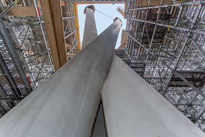 A self-compacting SB4 fine mix with a maximum aggregate size of 8mm was used. In order to rise 10.5m, the fresh concrete needed to be pumped at pressures of up to 200kN.