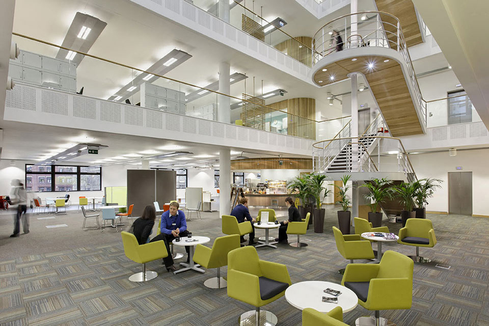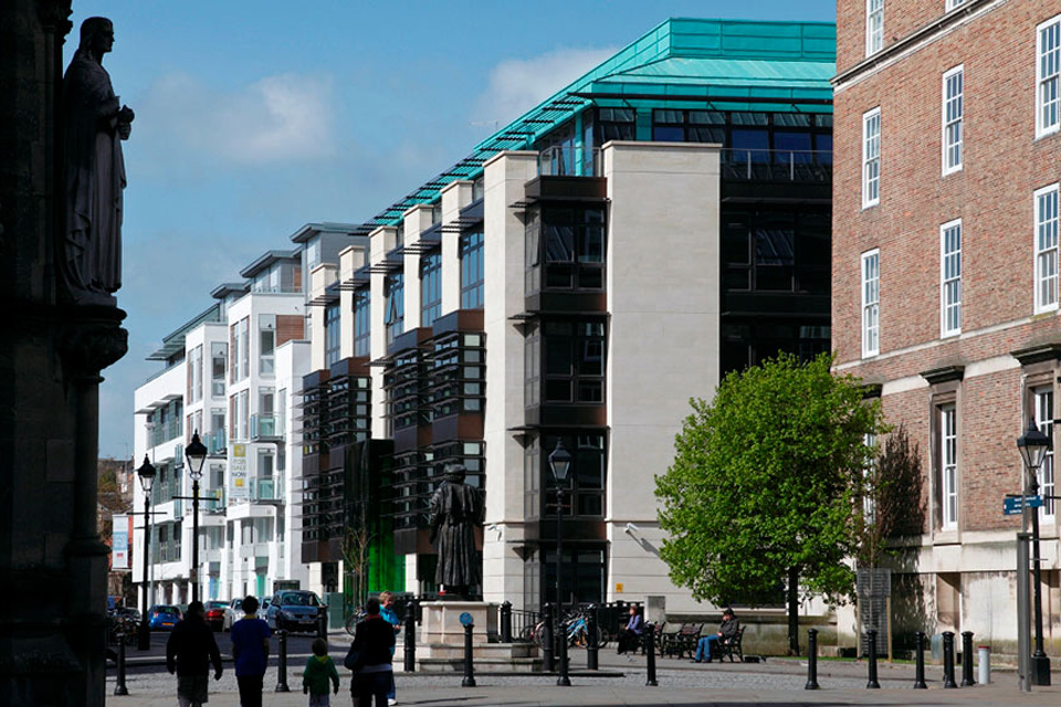 The 6,600m2 office building is part of a larger, mixed-use development in the centre of Bristol. Its Bath stone and bronze panelled facade has a structural stained glass entrance by the artist Kate Maestri, which provides a dynamic new street frontage. The office space is predominately open plan, based around a five-storey atrium.