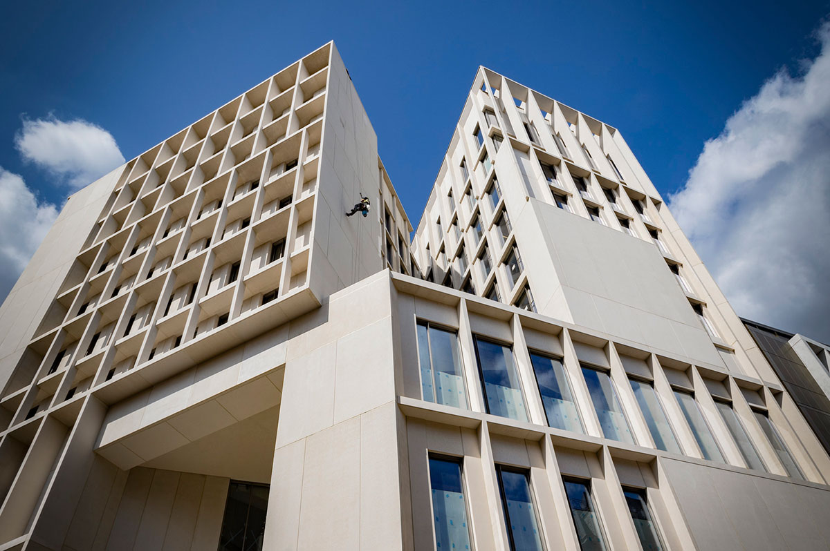 Unusually, Techrete used two slightly different mixes to create the facades – one with slightly more pigment than the other. “So the main fins are slightly darker than the panels behind them,” explains Sharkey. “This was because Grafton wanted the concrete to get a little lighter as you move from the edge in towards the building. We added to this effect by grit blasting the outer fins and the window panels behind them with the same level of pressure, while applying only a light grit blast to the recessed areas within the window panels. The lighter grit leaves the finish less textured and so it appears lighter.”