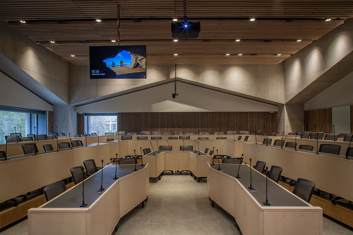 Around the perimeter are massive vault- like concrete structures, while a stunning curved, in-situ concrete feature staircase winds up to the first floor. Climb the steps and you discover more sloping beams, more vaults, more concrete. Wherever you are in the lower half of the building, the structure is very evident, all around you, everywhere. Critics have already acclaimed the sense of wonder this induces.