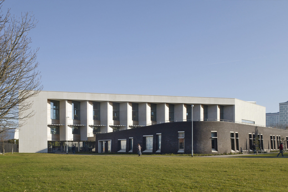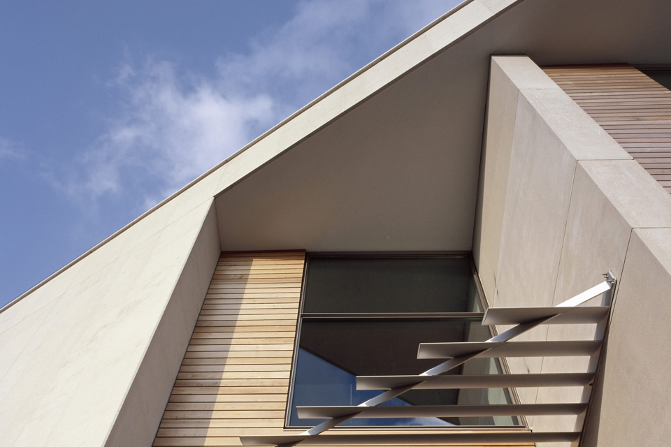 The basic orientation of the building, the facade treatment and the use of rooflights maximise opportunities for good day-lighting. The south-west elevation facing the park is an echeloned series of massive concrete fins dividing window bays. Windows thus face due south, making it easier to mitigate solar gain, reducing glare from low east and west sunlight and creating triangular study bays alongside the stacks. The façade flanking the entrance with a series of vertical slot windows acts as a giant, welcoming sign, exposing the inner life of the building.