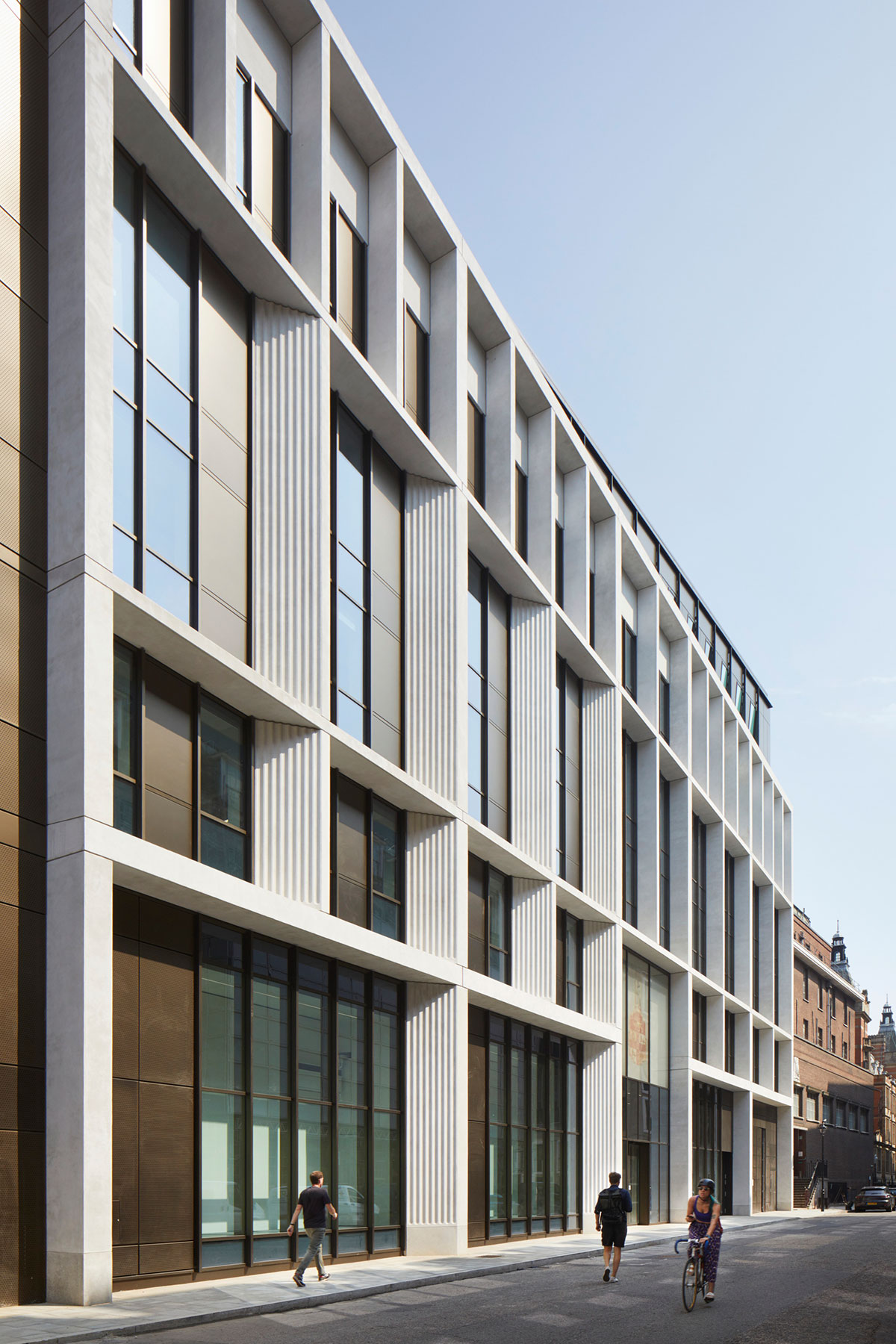 Precast concrete played another important role, Wadeson adds. Part of the complexity of this project derived from its central London site. There was not only a listed building directly in front, but the construction site for Grafton Architects’ Marshall Building for the London School of Economics immediately next door. “There were two live sites, and in terms of both demolition and the new concrete frames, they would accelerate past one another alternately. For any works on the boundary, there were obviously really critical health and safety issues.” The original design was for a hand-laid brick wall, but this would have proved time-consuming, increasing the time spent working at the boundary. “We changed the design to maximize the efficiency of how quickly it could go up, using brick-faced precast panels that we could drop down between the two concrete frames. The speed of that was obviously far, far quicker.” The walls were then sealed and insulated from the inside.