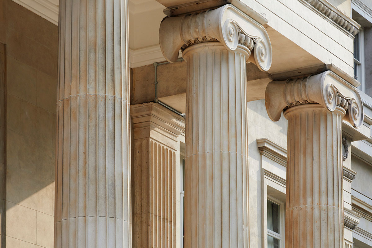 The aesthetic here references the classical north facade while also being emphatically modern. “The expressed concrete is something that’s obviously new, while also alluding to the historic masonry,” says Wadeson. “We deliberately gave it a slightly different tone – a bit more sandstone, a bit yellower.” The precast also incorporates a fluted motif that echoes the porticoed columns of the Barry entrance, but with sharper, more contemporary lines.