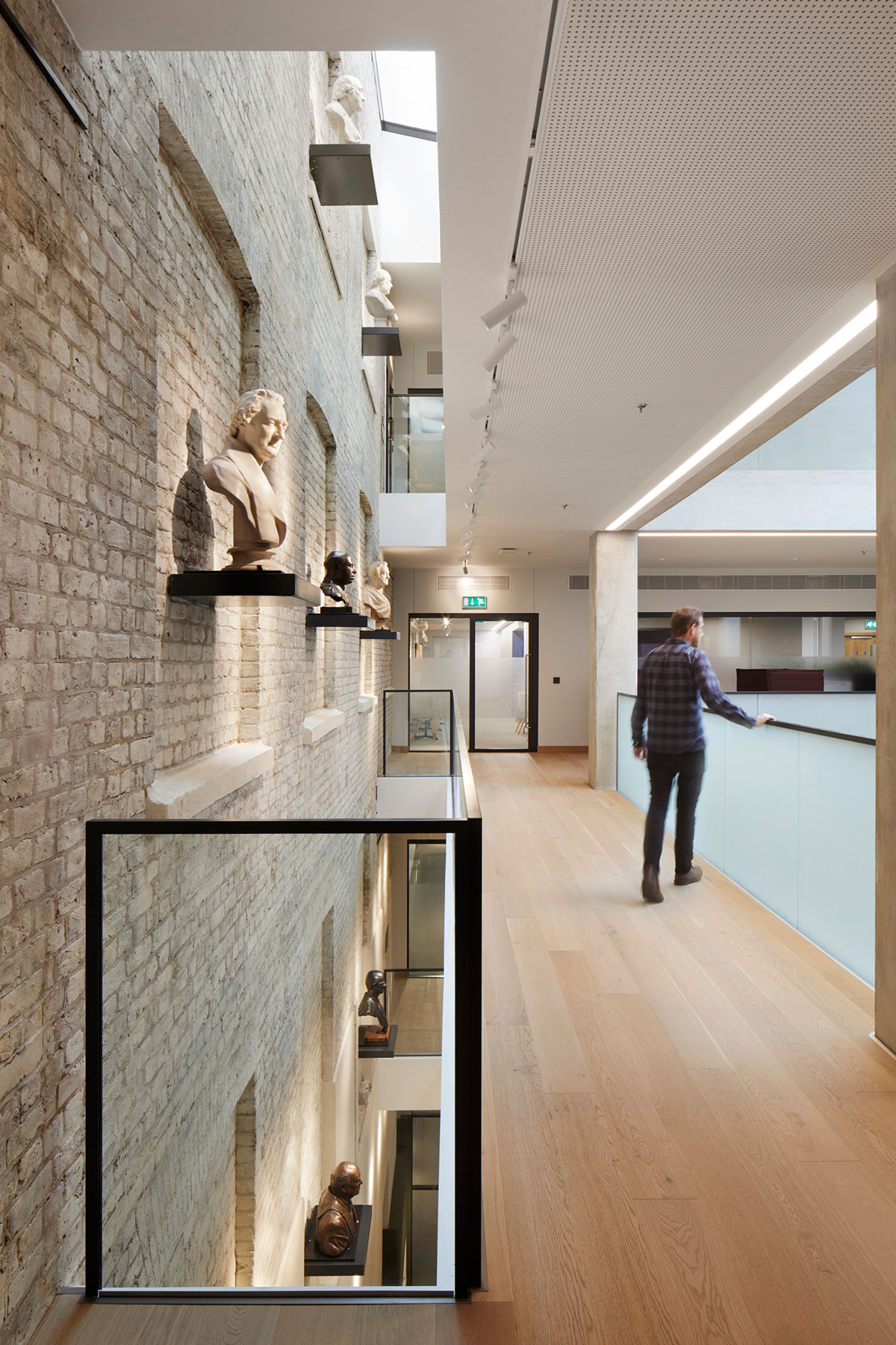 The most dramatic intervention has been the introduction of a new light-filled atrium under a barrel-vaulted glazed roof. This is structurally independent, with the concrete frame cantilevering towards the Barry building’s rear elevation and simply fixing into it via a slotted connection. “The new structure pulls back from the historic brick facade to give it breathing space,” explains Wadeson. The brickwork has been limewashed and the windows have been filled in to form niches to display busts and other objects from the college’s extensive collection.