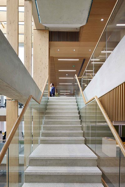 There is a great deal of timber used throughout the building. It part-panels some interior columns and, on each floor, timber slatting part-covers the concrete ribbed slab soffits where they meet the atrium space. “The timber works hard acoustically,” says Pinfield. “The atrium is completely open to help provide connectivity between different departments, and people can easily see colleagues on different floors (see box). But the risk is noise transmission, so the ribbed slabs are useful here as they help disrupt sound reflections.”