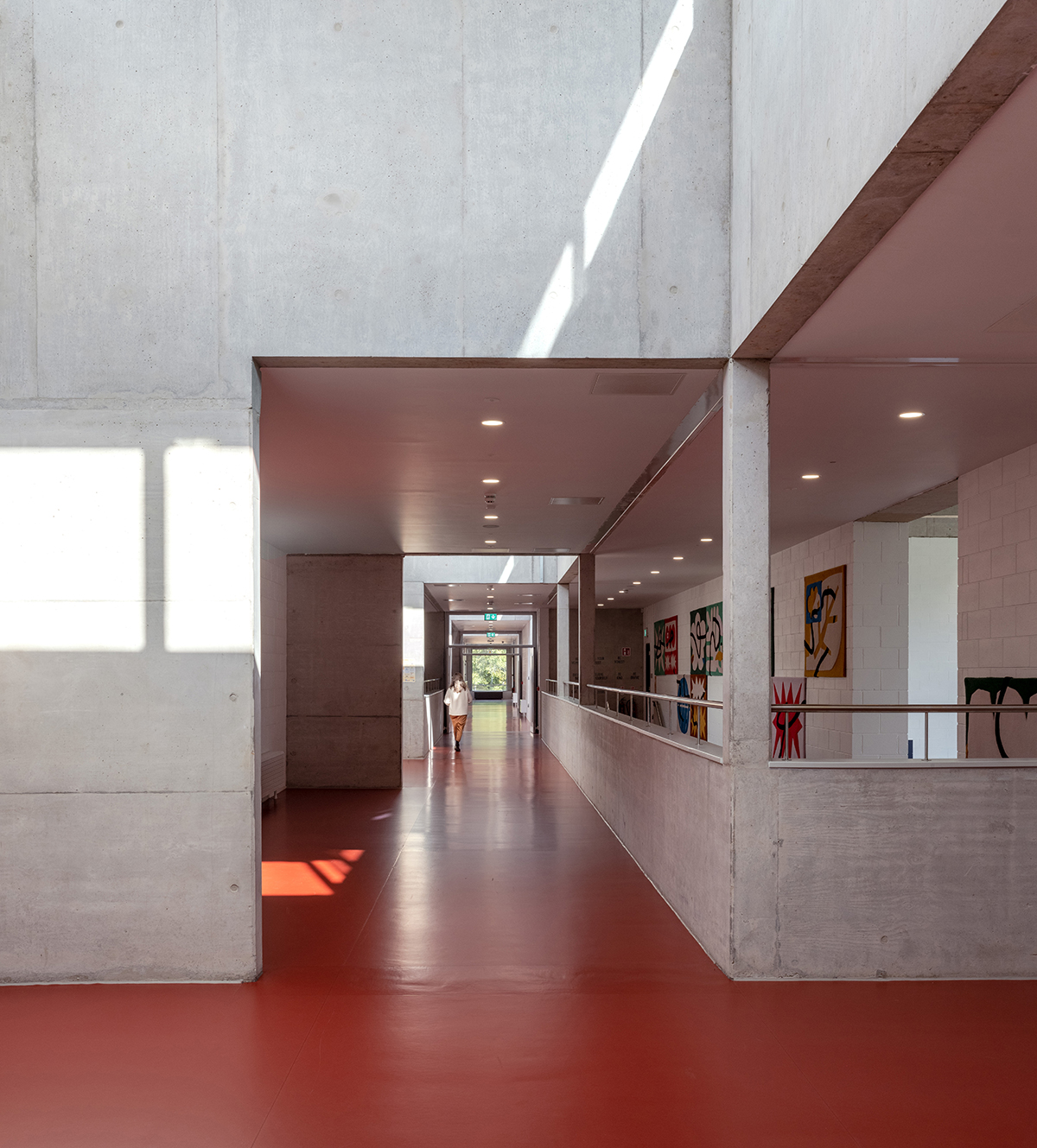 Each wing is arranged around a 4m-wide central spine, with classrooms on either side. The generous width of this space has allowed the architects to offset the ground and first-floor corridors and carve out overlaps and double-height voids. In the “social areas” where two wings meet, the concrete walls rise up more than 6m.