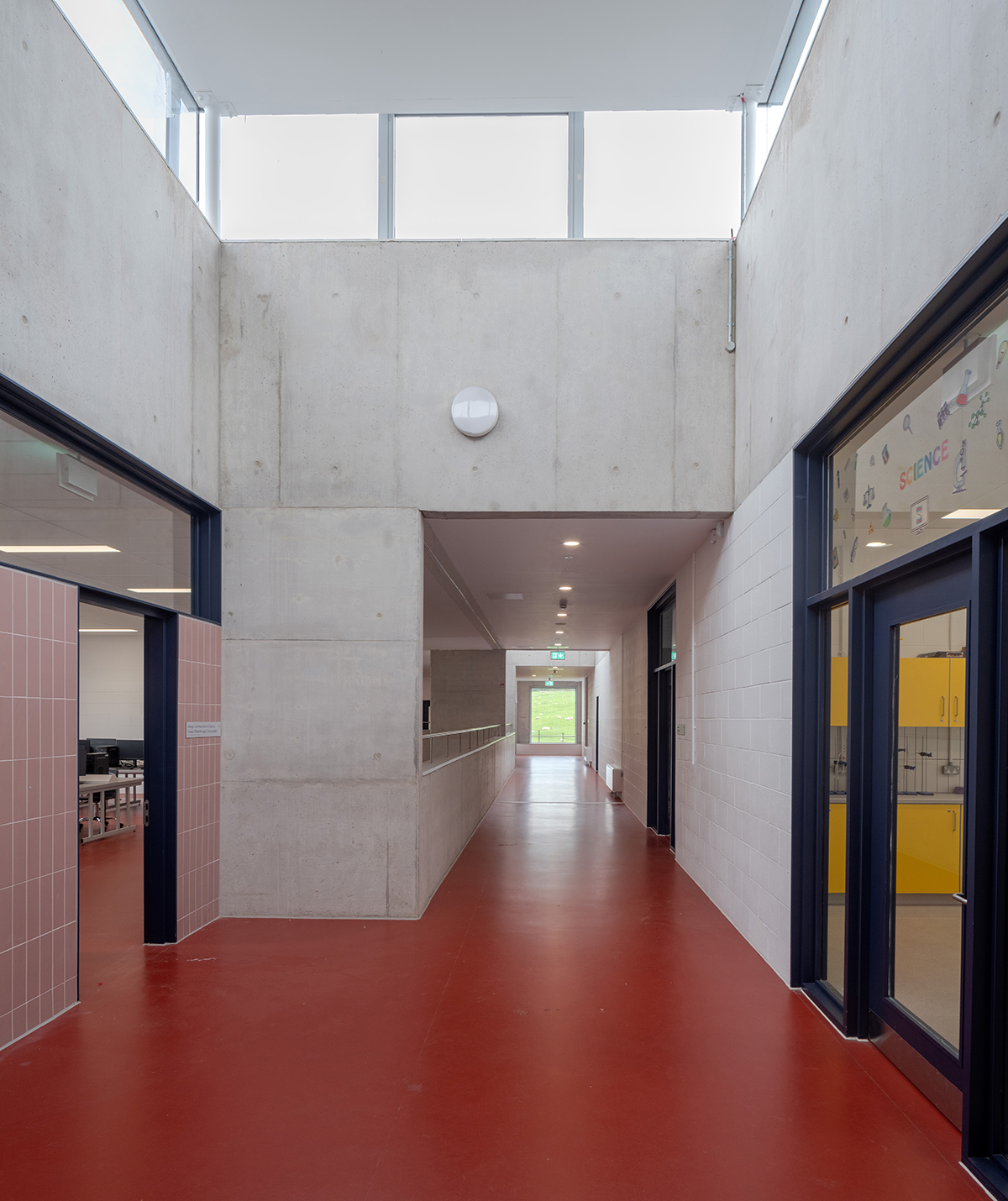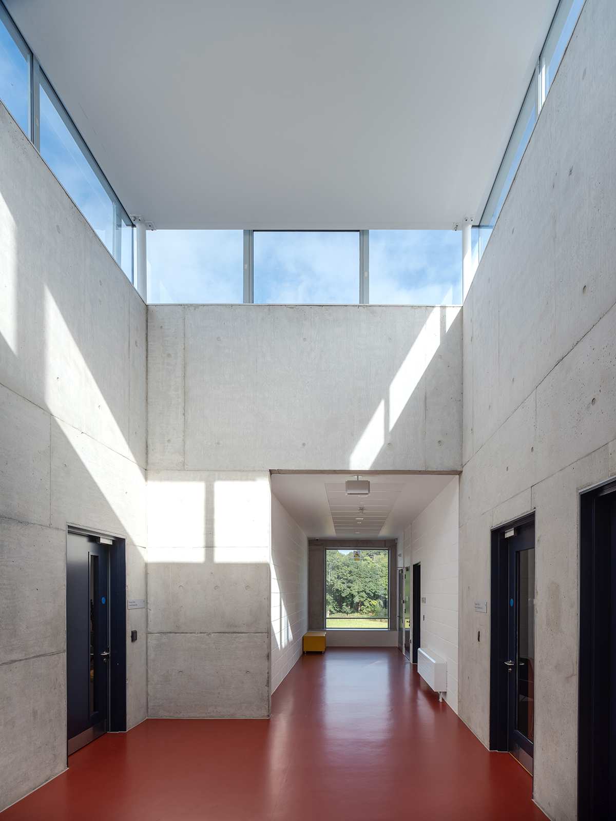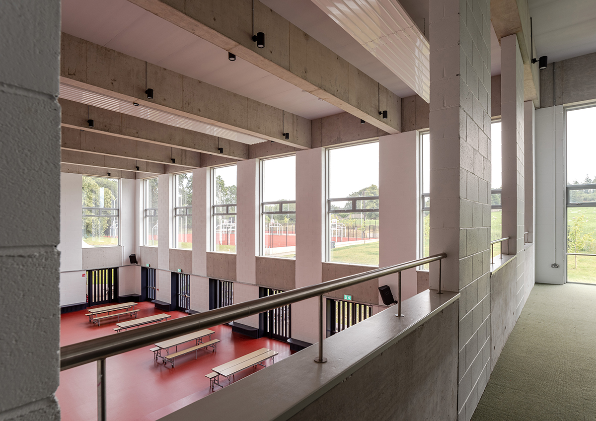 All of the in-situ concrete contained 40% GGBS. Its pale colour is complemented by the blockwork used for the inner leaf of the insulated cavity walls, piers and classrooms, which was left exposed and painted white. Rust-red resin flooring throughout makes for a striking contrast.