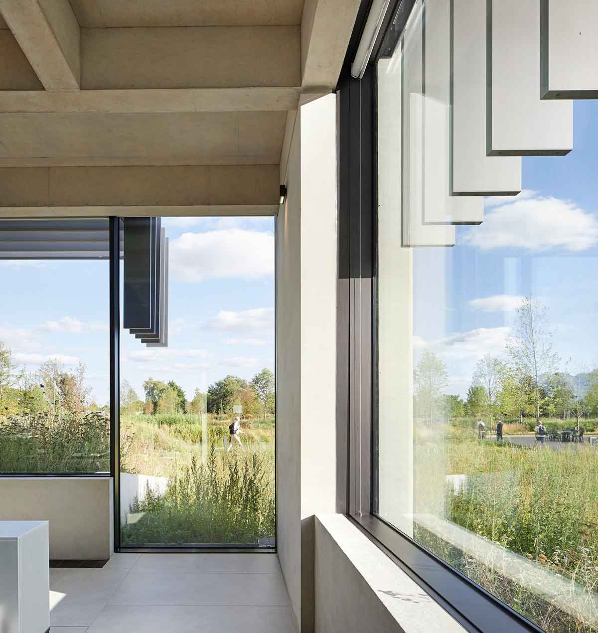Sheppard Robson’s solution has been to create a single-storey building with a repeating grid of 15m x 15m “plug and play” modules set within a gallery-like frame of pristine concrete corridors. Each module contains either a lab, office or meeting room and operates as an independent cell. Three high-containments labs, at the north end of the building, are served by rooftop plant directly above, connected via openings cast into the slab. “That means that if you want to change the configuration of the facility, you can just drop the servicing straight through the ceiling.”