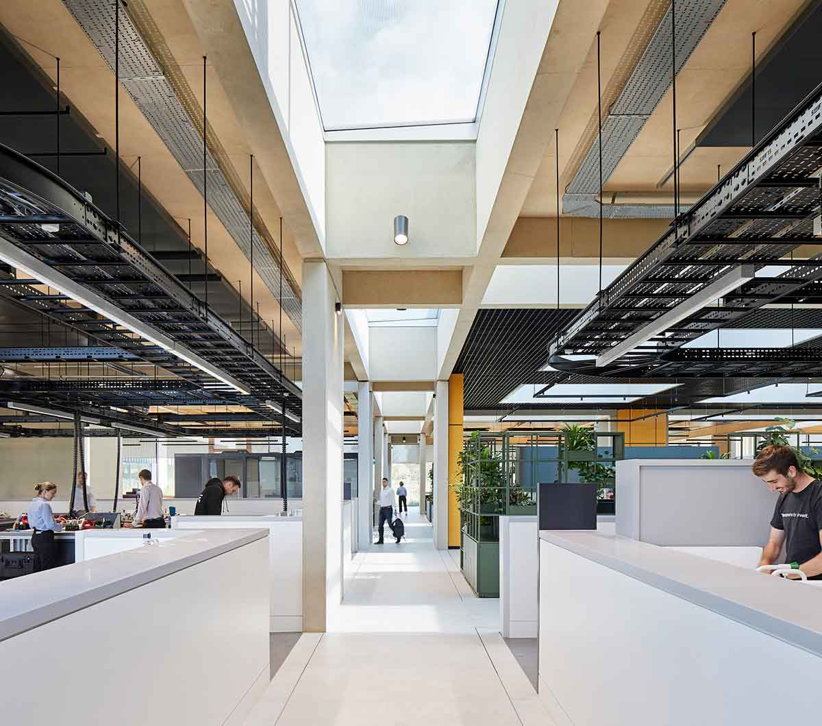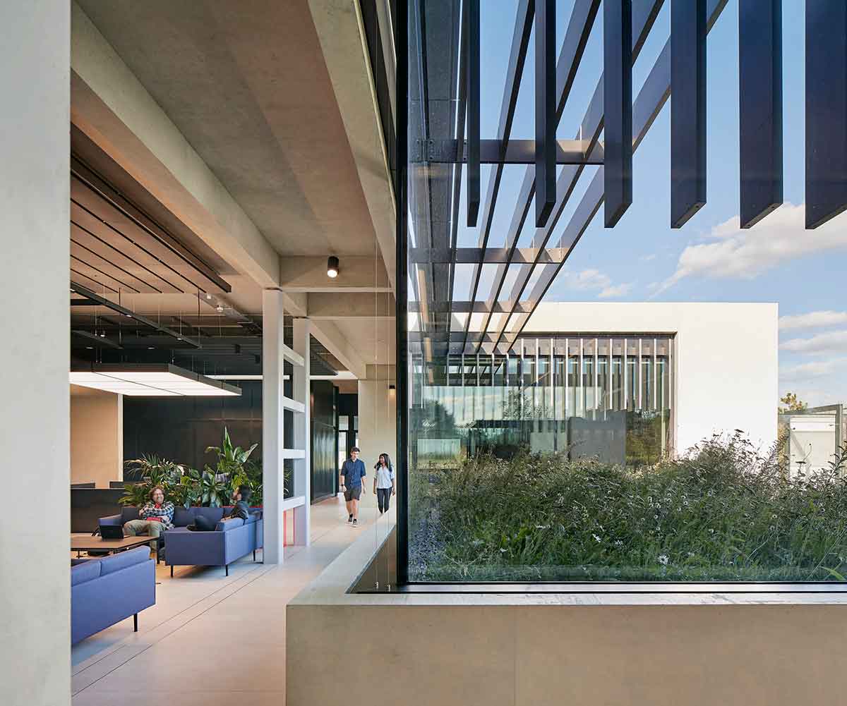 All of the other modules can be repurposed to be either fully lab or fully office. A post-tensioned concrete roof slab enables each space to be column-free, maximising flexibility. Light and data servicing run from a 600mm floor void up to up to flexible ceiling tracks cast into the slabs. “They can be refitted without disrupting the rest of the building,” says Ardill. “You just close that space off and the building can operate around it.”