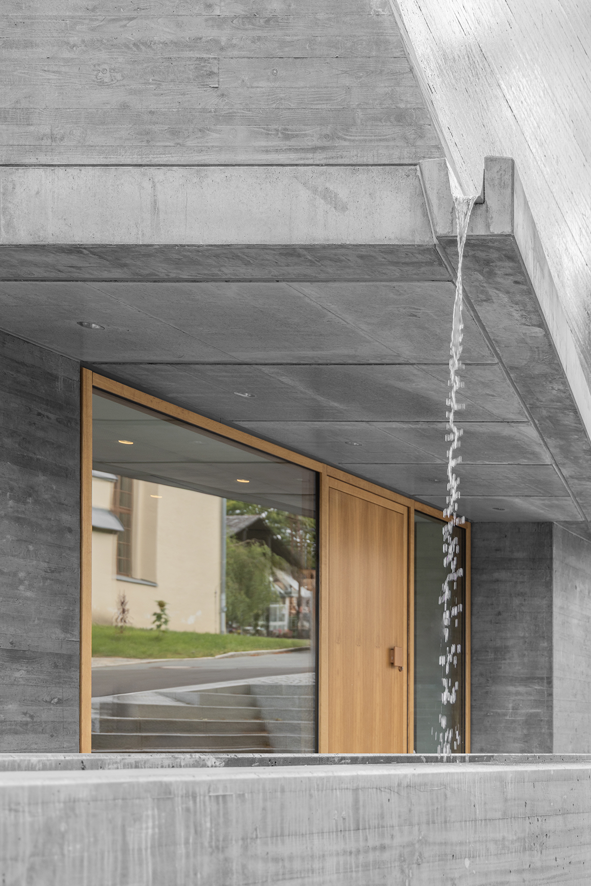 This creates an overhang to the entrance below and twists the whole wall into a double curve. The concrete wall suggests a mussel shell in other ways too. Anthracite pigments give a dark grey tone, while the narrow horizontal lines of the timber formwork evoke the crustacean’s annual growth rings. Water flows continuously over the rough surface of the wall, “symbolising the basis for life of mussels”, says Schulz.