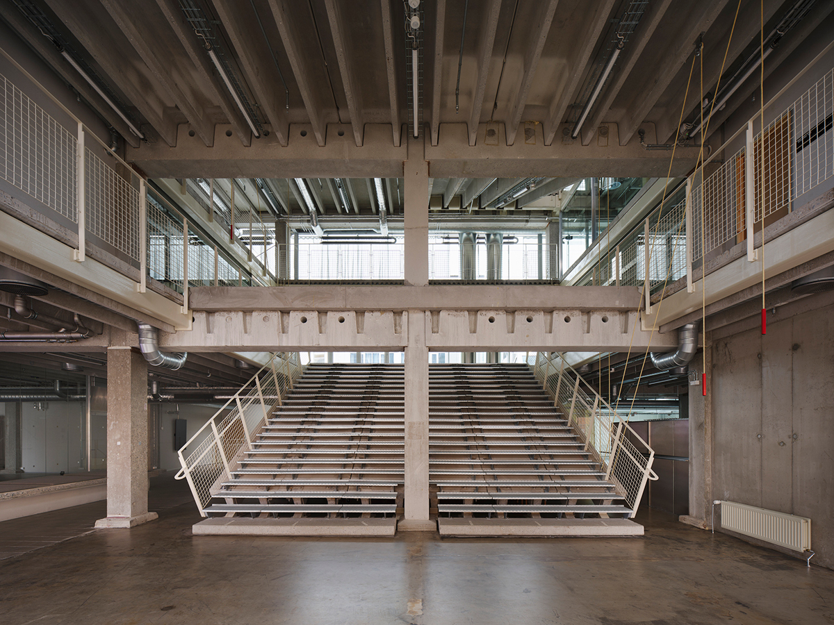 The former fur warehouse was a long, horizontal four-storey building, with low ceilings and poor natural lighting – hardly a promising space for galleries and artists’ studios. Behind the street-facing facade of brick panels and bands of glazing, it had a precast concrete structure of columns and 1.2m-wide TT beams, joined together into floorplates. By cutting out six beams to create a huge 7m x 7.2m opening in the floor and then lowering one end like a drawbridge, Pihlmann has unlocked a variety of larger spaces and vertical connections.