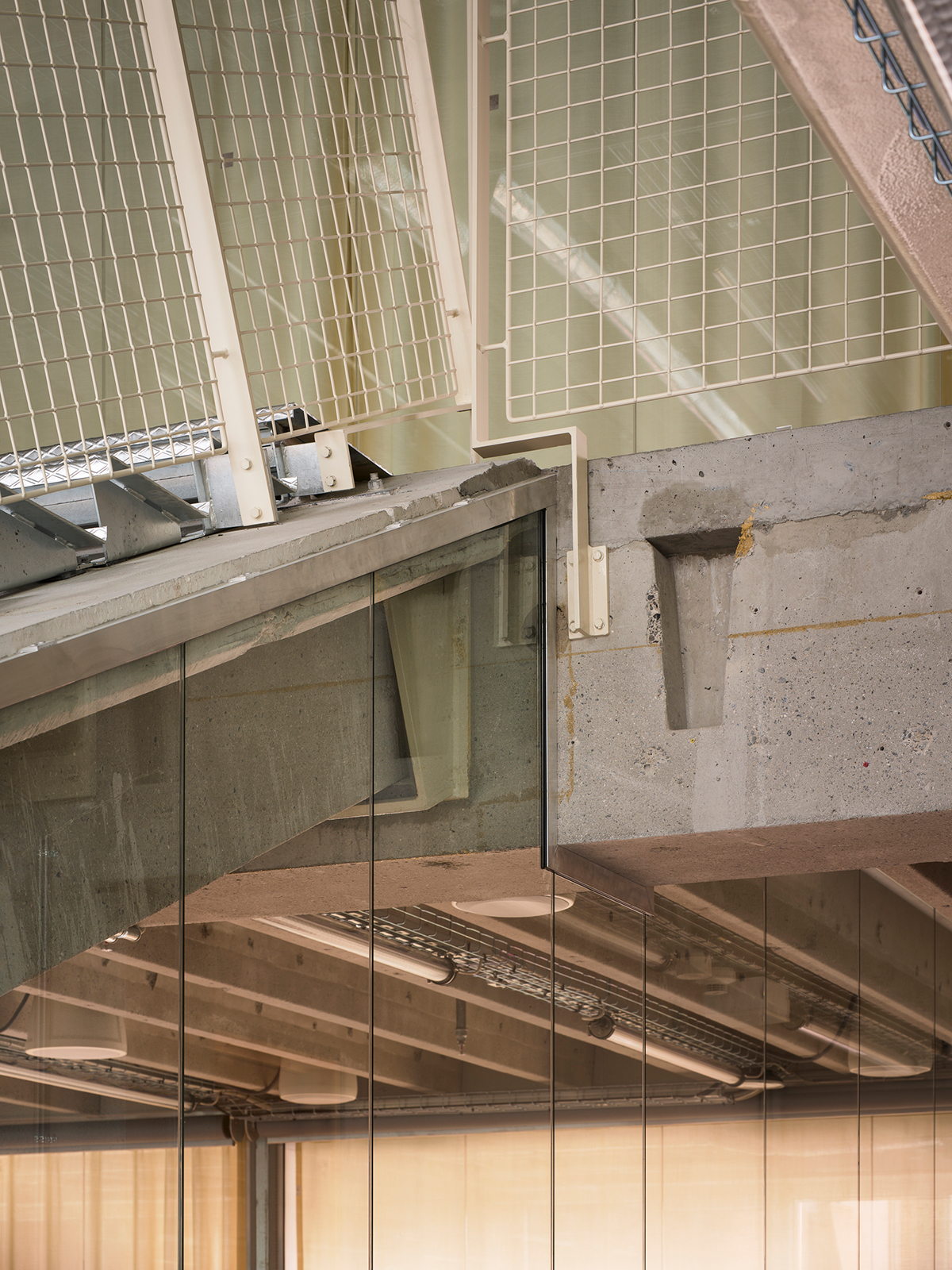 The stair treads, which are supported by brackets fixed to the TT beams, have a bent profile with seams that align with the joints between the concrete elements. “There are a lot of details that you notice in person but you can't quite communicate with an image,” says Priddle. “Where the guardrail intersects a column, for example, it sweeps behind it in quite a playful way. We’ve used a lot of these fun little gestures to draw attention to certain things.”