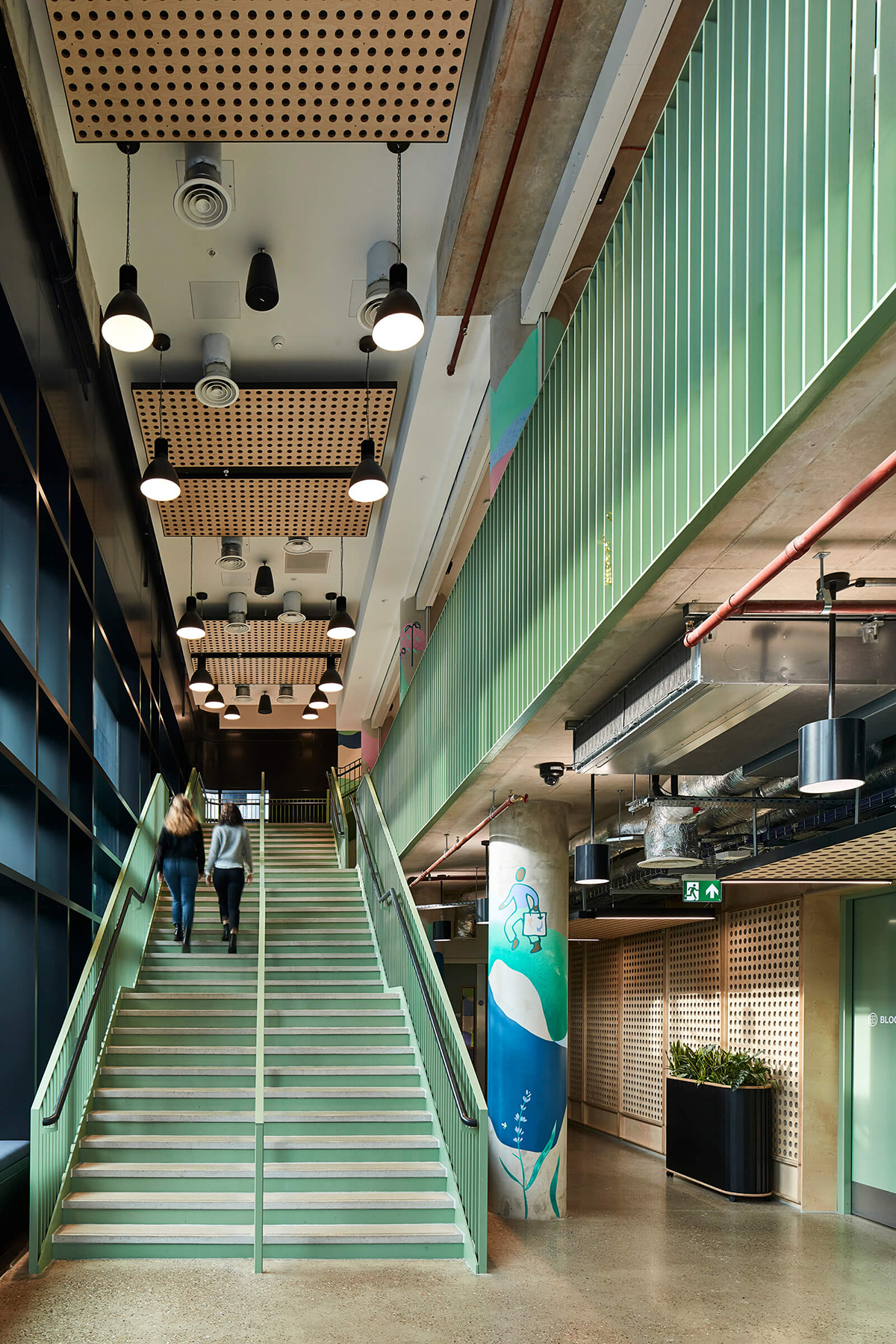 All four towers were designed by Allford Hall Monaghan Morris, and step from 11 to 19 storeys in a slightly askew arrangement. The three student towers, which contain 852 bedrooms, are clad in glazed terracotta, in shades of blue, green and purple. The fourth tower – dark grey with horizontal bands of glazing – is an office building. This is not part of the Passivhaus scheme, but it has achieved a BREEAM Outstanding rating, partly thanks to an innovative low-carbon precast concrete floor system.