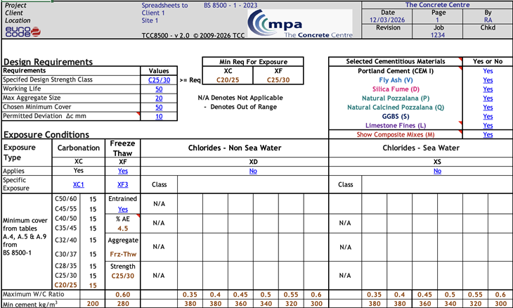 TCC-BS 8500 Tool simplifies the specification of concrete to BS 8500 by allowing the user to input the exposure classes, design strength and cover. The spreadsheet then highlights the limiting values required to satisfy the durability requirements for given cement types. All the exposure classes are covered – carbonation, chlorides, sulfates and freeze thaw attack. In the latest version of BS 8500 the different cement types are collated into combined performance categories (CPCs) depending on their ability to resist sulfate and chloride attack. The results from the TCC 8500 spreadsheet give the CPCs that will meet the required resistance.