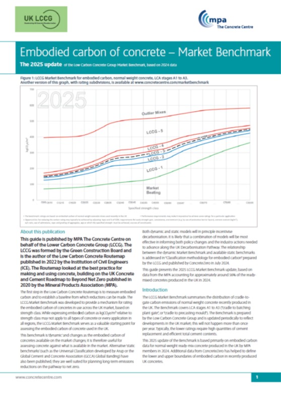 This guide presents the 2025 LCCG Market Benchmark update, based on data from the MPA accounting for approximately around 56% of the ready-mixed concretes produced in the UK in 2024.This benchmark is ‘dynamic’ and changes as the embodied carbon of concretes available on the market changes; it is therefore useful for assessing concrete against what is available in the market.