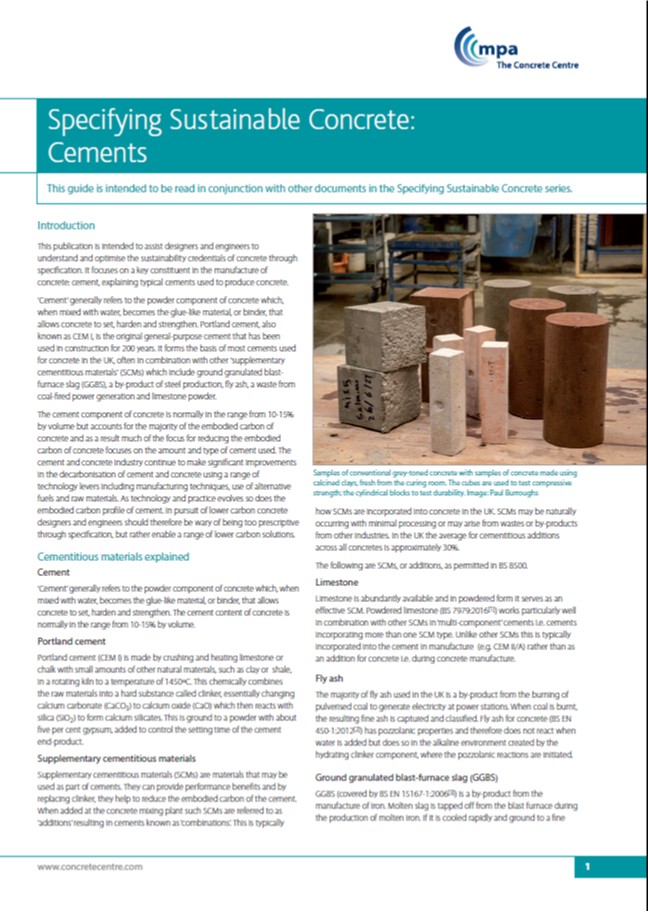‘Cement’ generally refers to the powder component of concrete which, when mixed with water, becomes the glue-like material, or binder, that allows concrete to set, harden and strengthen. This publication is intended to assist designers and engineers to understand and optimise the sustainability credentials of concrete through specification. It focuses on a key constituent in the manufacture of concrete: cement, explaining typical cements used to produce concrete.