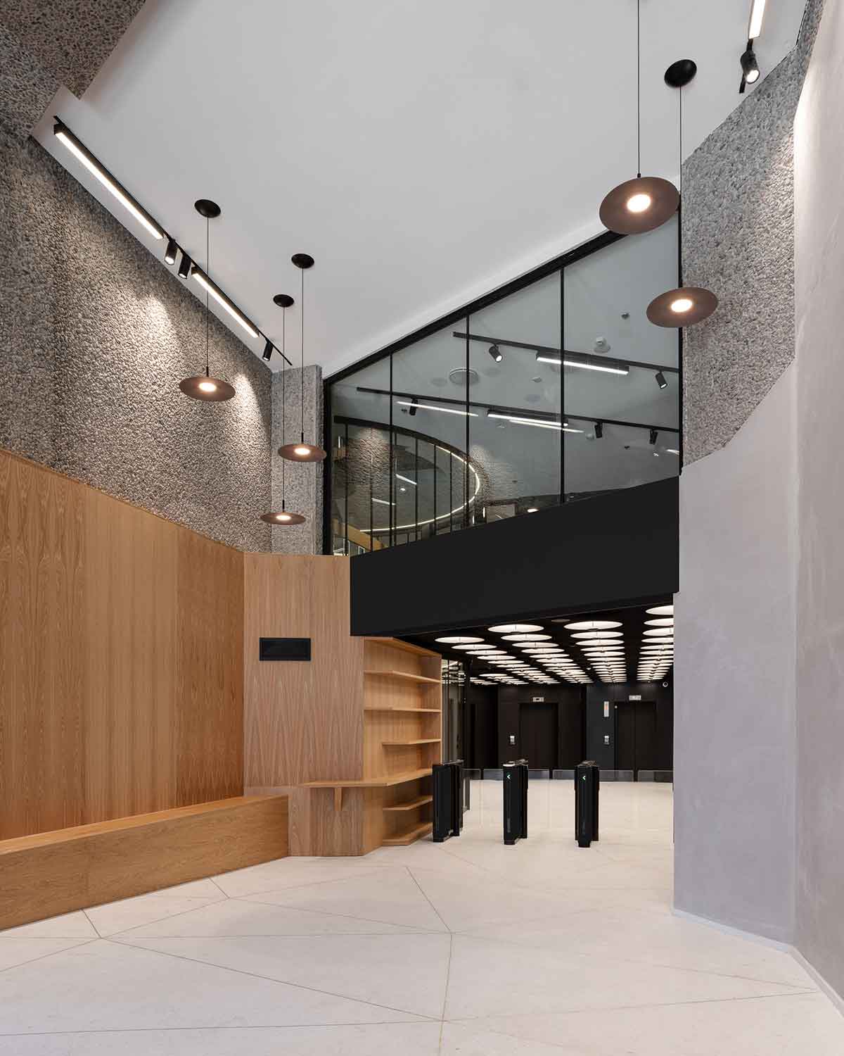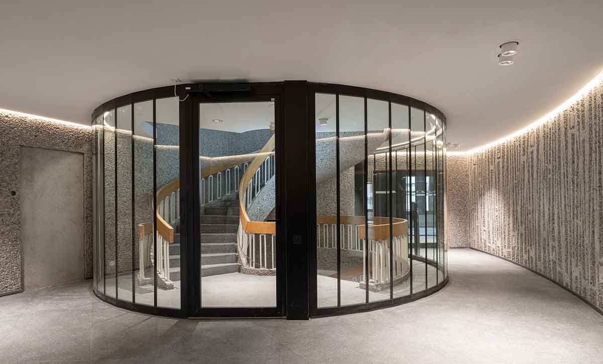 A precast concrete spiral staircase has been inserted, leading up to the new ninth floor. This was lifted into the building in two parts through the roof. Selmer says that special care was taken to echo the colour and mix of the original naturbetong stair, although the pebbles are smaller and a more conventional casting method was used.